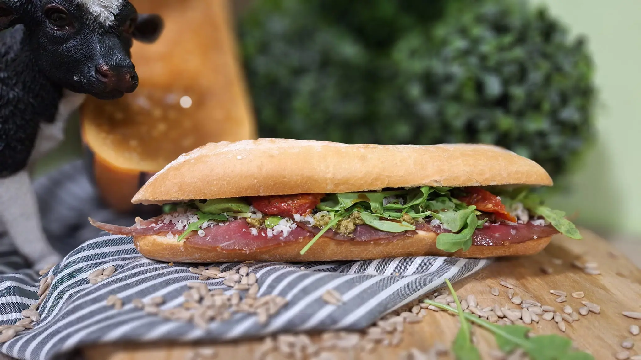 Broodje Carpaccio: vers belegd broodje met carpaccio, rucola, zongedroogde tomaatjes, zonnebloempitjes, groene pesto, balsamico-dressing en parmezaan.
